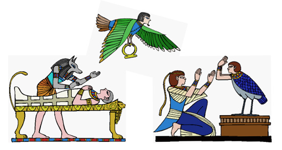Damit ein Mensch unsterblich werden konnte, mussten alle drei Seelen immer wieder zum Körper des Verstorbenen zurückkehren. Denn ohne diesen würden sie sich im Nichts verlieren. Deshalb begannen die Ägypter, ihre Toten zu mumifizieren und so die Körper für die Rückkehr der Seelen zu erhalten.