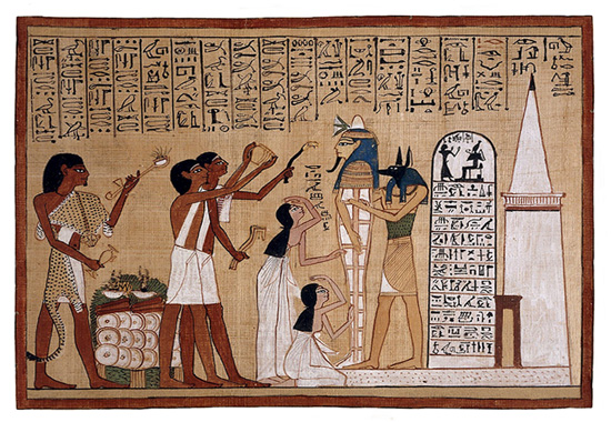 Wenn ein Mensch gestorben war, brachte man ihn zur Einbalsamierung in eine Mumifizierungswerkstätte. Diese, nach festen Regeln durchgeführte Einbalsamierung wurde von einem Priester, der die Schakalmaske des Totengottes Anubis trug, beaufsichtigt.